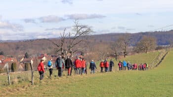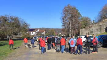Sous le soleil et le ciel bleu, 17 personnes prennent le départ depuis l’église de Dolleren en direction de Sewen.