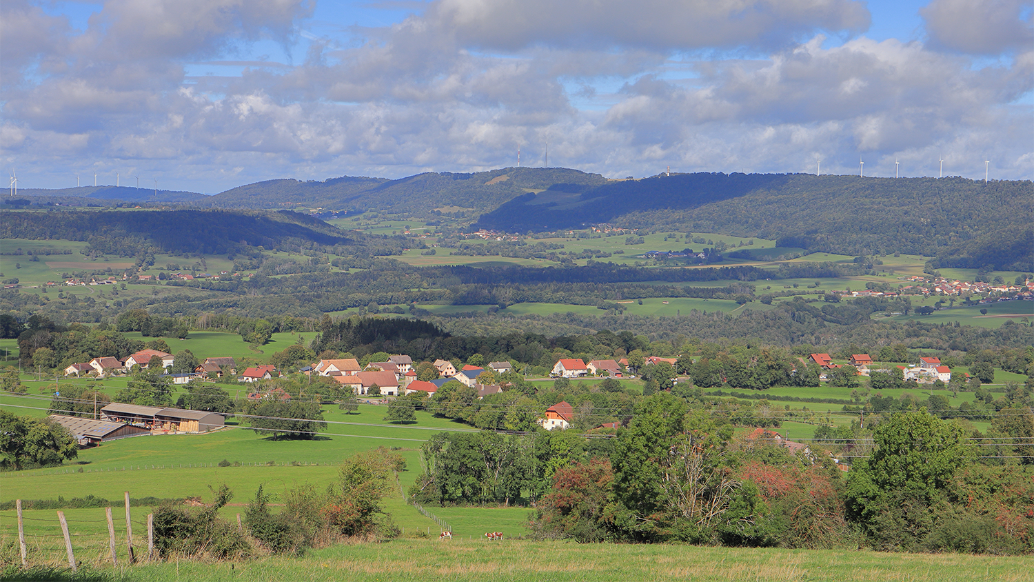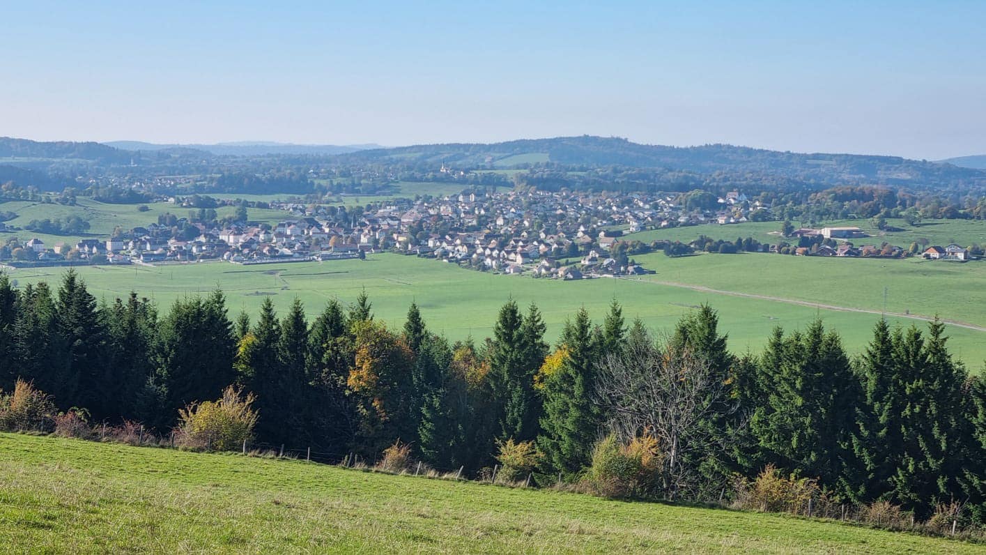 Nous commençons par grimper jusqu’au belvédère qui surplombe St-Hippolyte avant de poursuivre notre route pour arriver à un deuxième belvédère « Sous le Pré » qui cette fois domine Soulce Cernay.