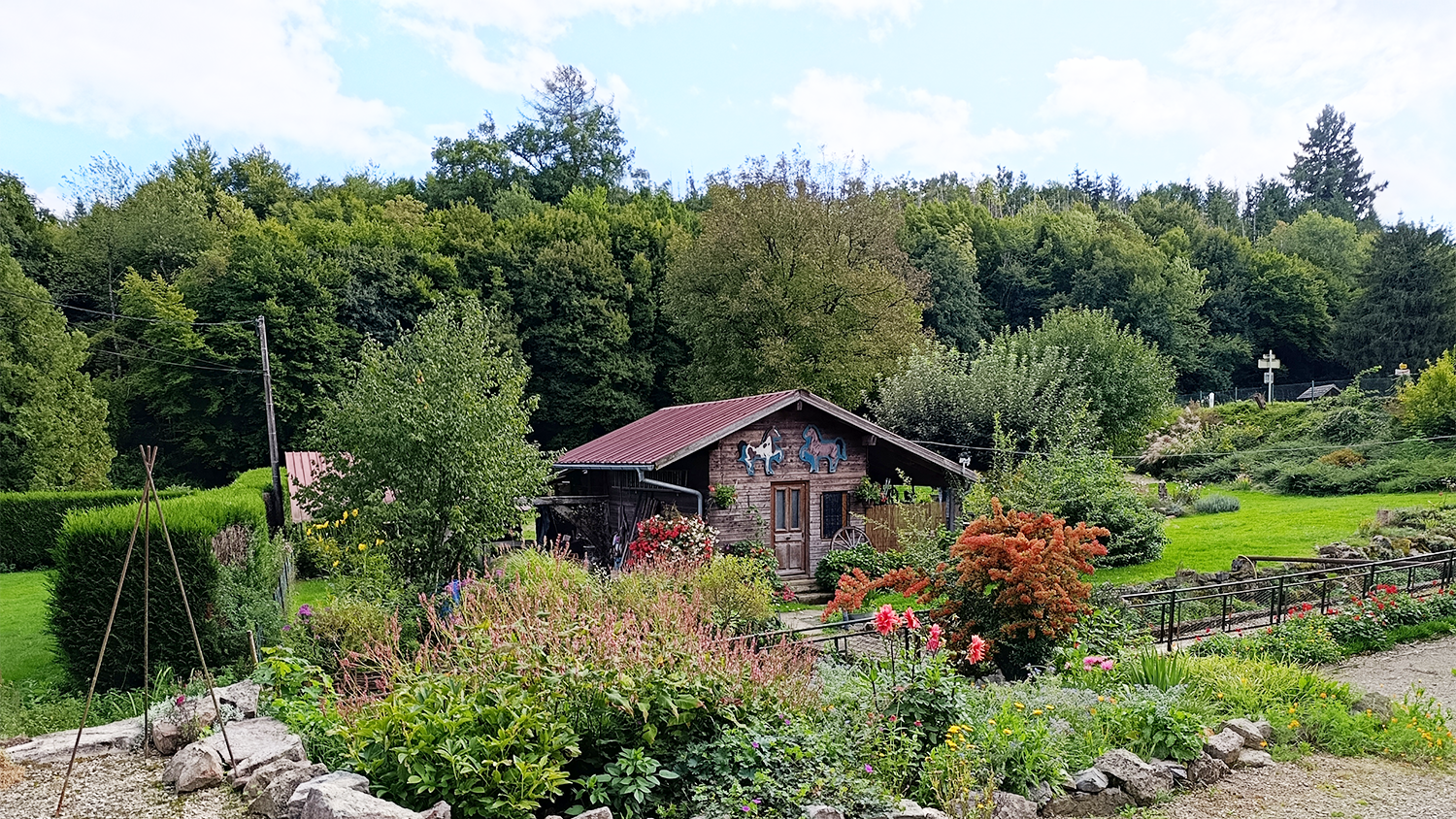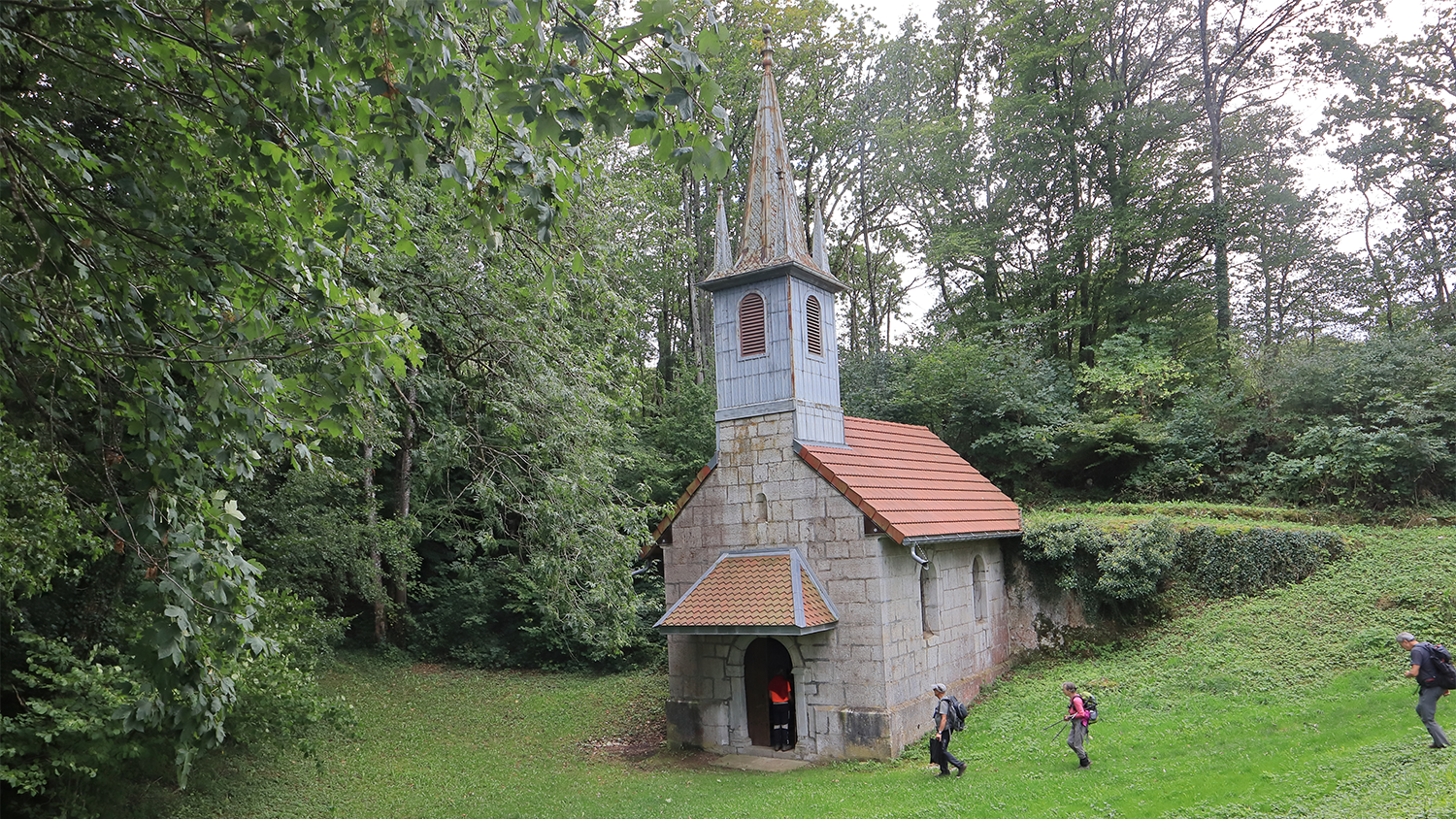 Nous reprenons notre route au milieu des pâtures pour arriver à la ferme de Vacherie Mouillard où un gentil monsieur nous invite à découvrir une petite chapelle.