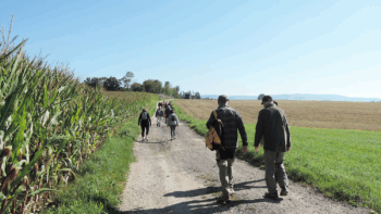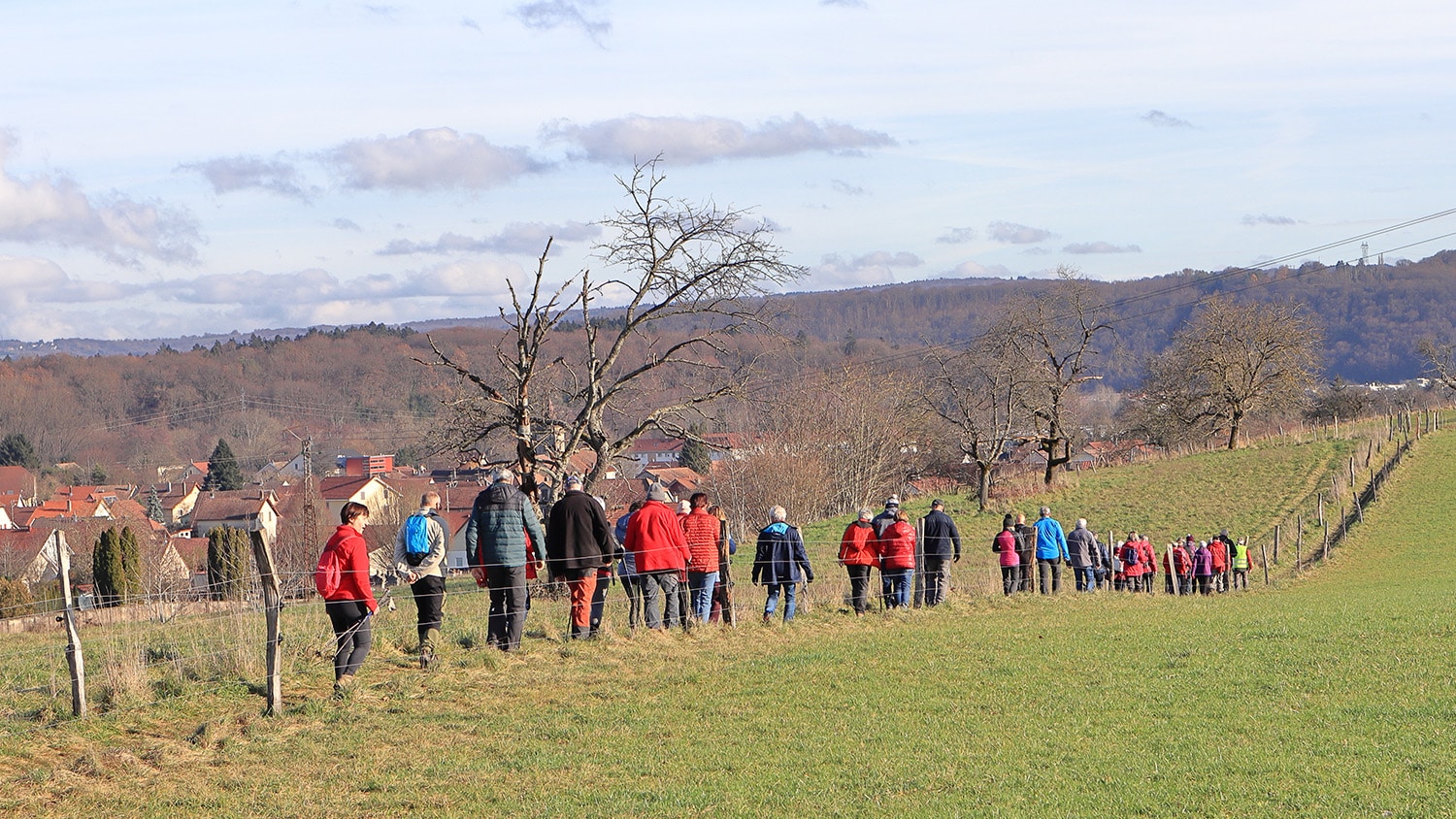 Sous le soleil et le ciel bleu, 17 personnes prennent le départ depuis l’église de Dolleren en direction de Sewen.