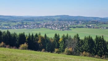 Après avoir traversé le village nous poursuivons notre chemin dans les bois pour arriver à un premier point de vue complément caché par la végétation, puis à un deuxième où nous pouvons enfin admirer la vue sur Ronchamp et ses environs.