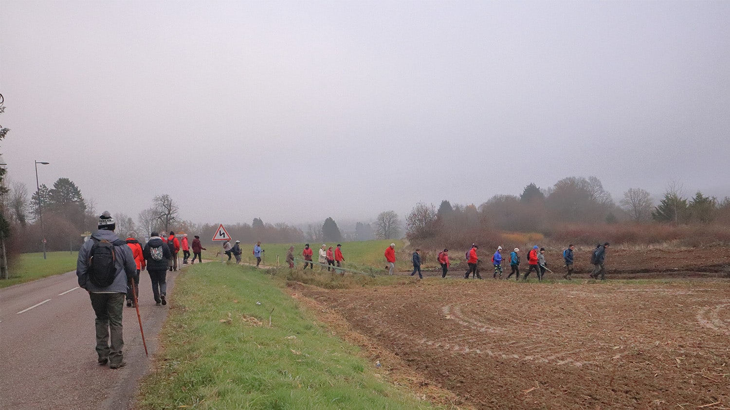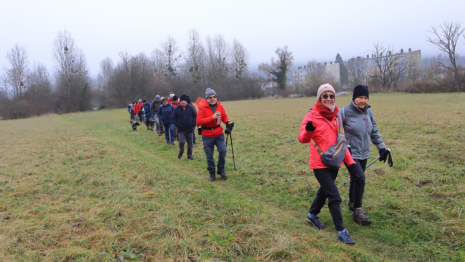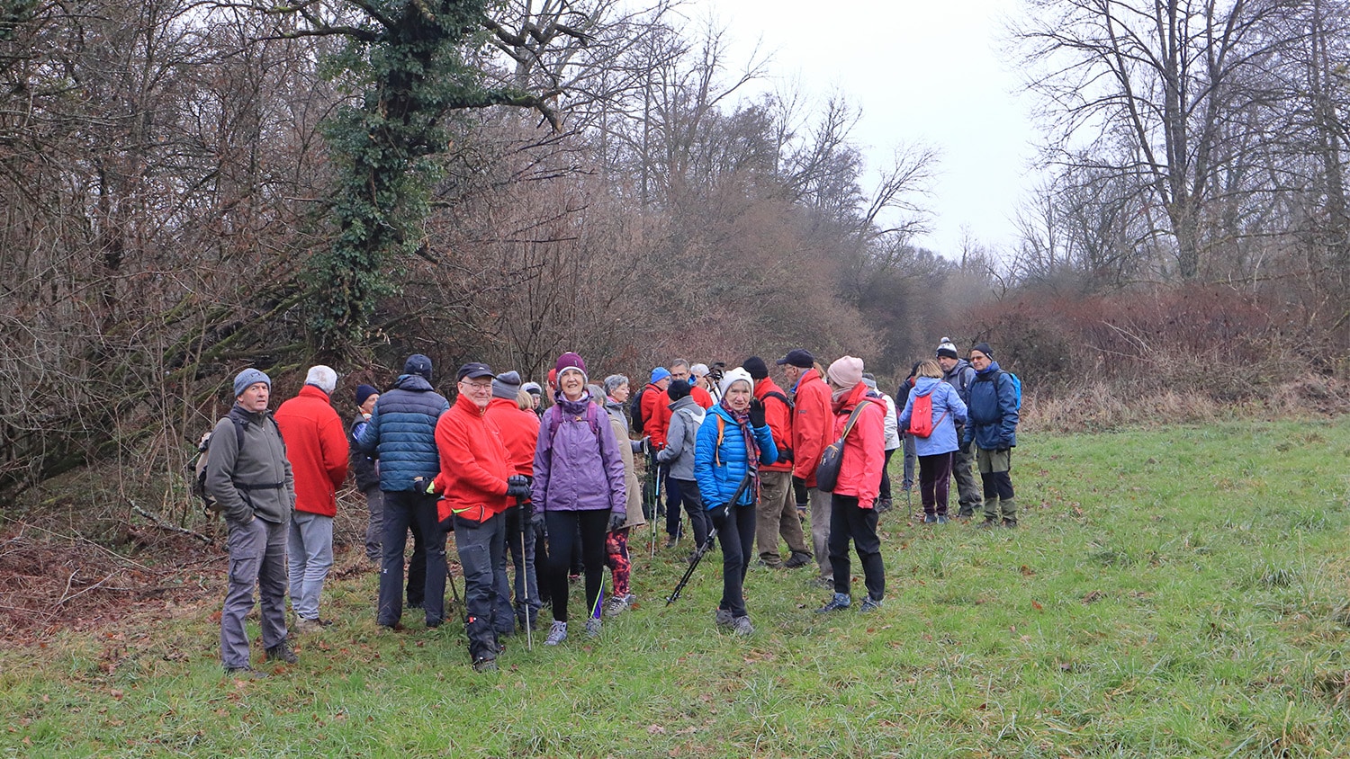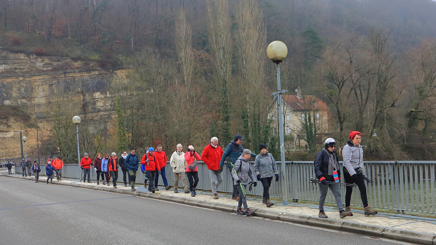Vingt- six personnes se sont retrouvées au belvédère de Mandeure malgré le froid, le brouillard et la bruine, il y a bien longtemps que nous n’avions vu autant de monde sur une marche douce.