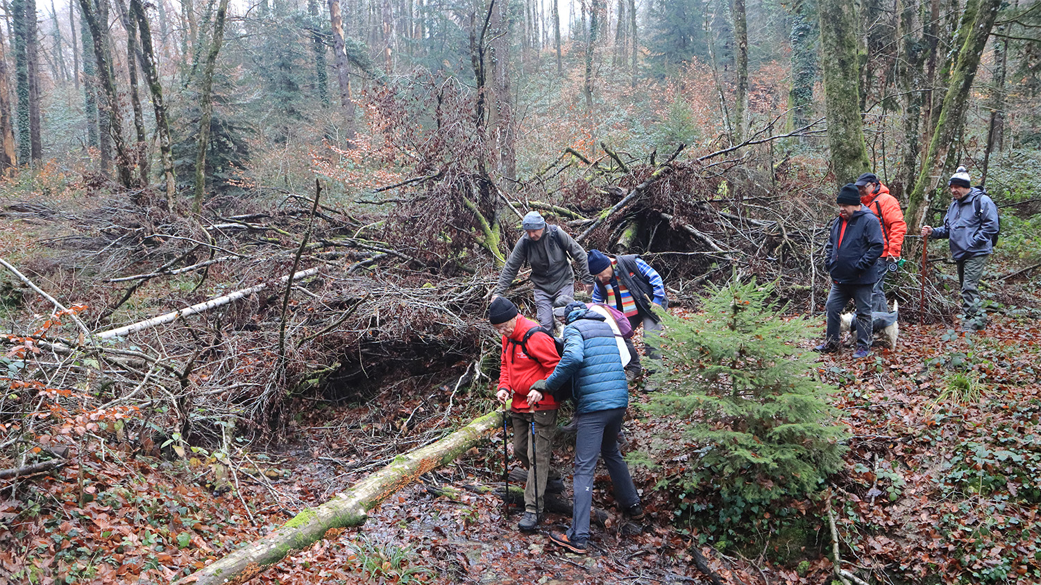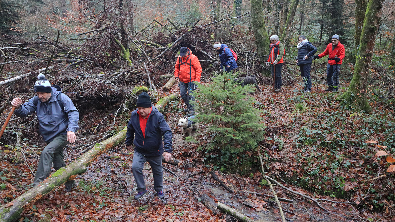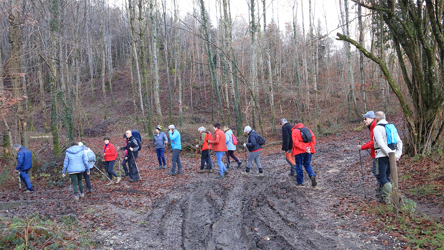 2ème marche à la demi journée de la nouvelle année. Malgré une très forte pluie la nuit et un temps maussade le matin, 20 personnes se sont retrouvés sur le parking de la Blongeotte pour une marche de 10 km qui nous a emmené sur le chemin de Turchaux puis le long de la piste de Belchamps. Retour par le chemin qui longe l’autoroute, beau chemin mais assez brillant ! La chance ne nous a pas sourit jusquà nos voitures car un débardage de grumes a eu lieu ces jours ci rendant le dernier km très boueux.